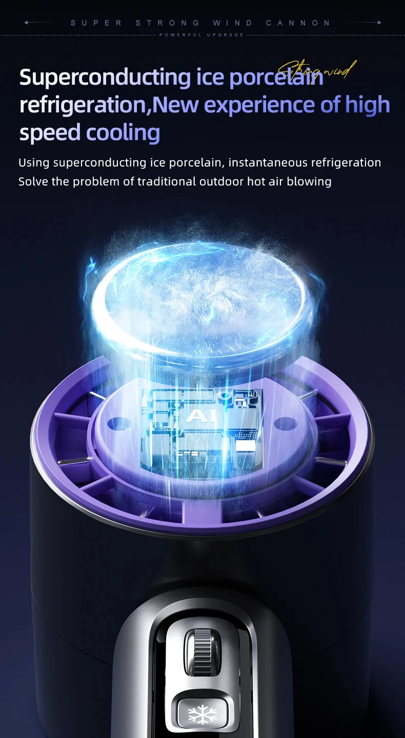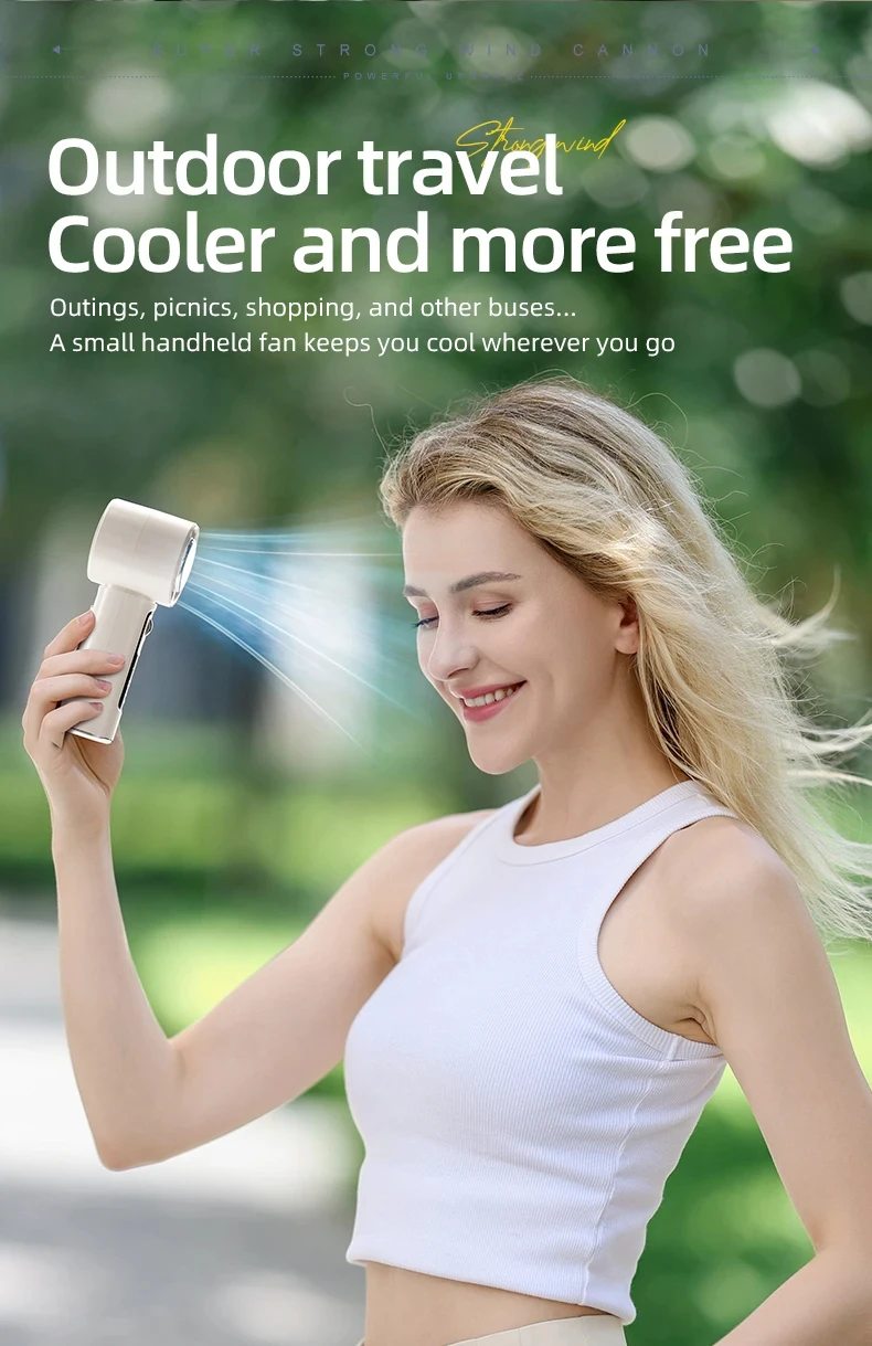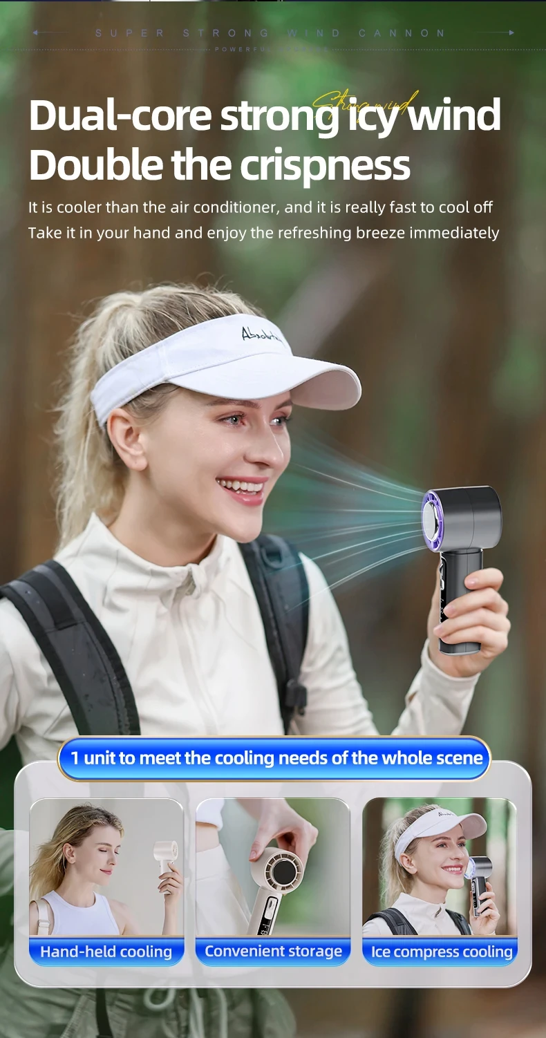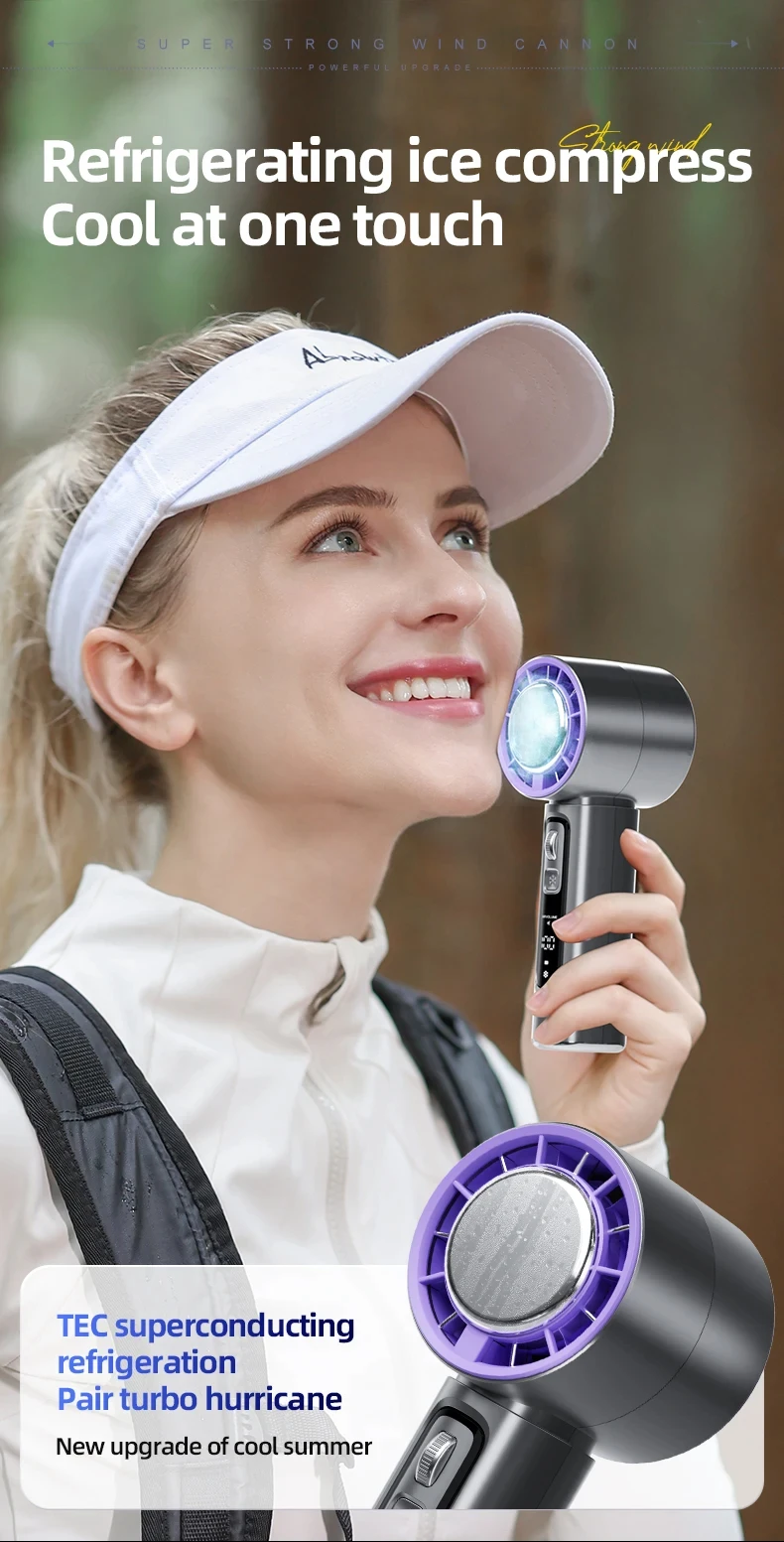 Introducing the Ice-cooling High-Speed Handheld Fan, a state-of-the-art cooling device designed for powerful performance and advanced features. Ideal for personal use, this fan incorporates innovative cooling technology and smart design elements for enhanced comfort.