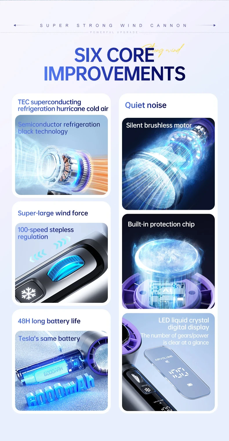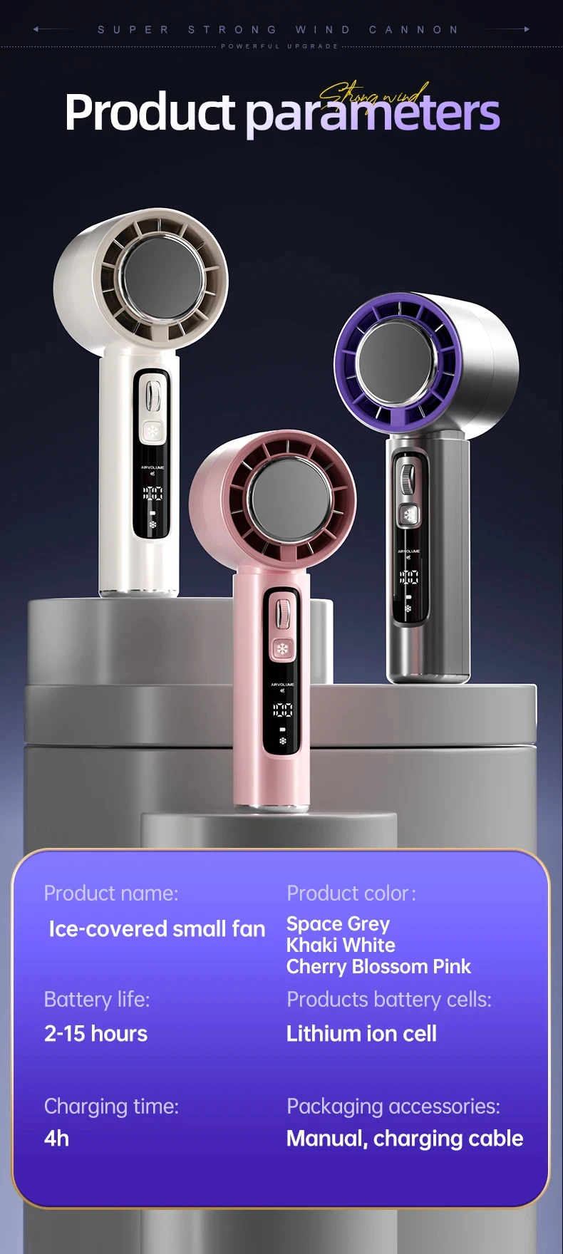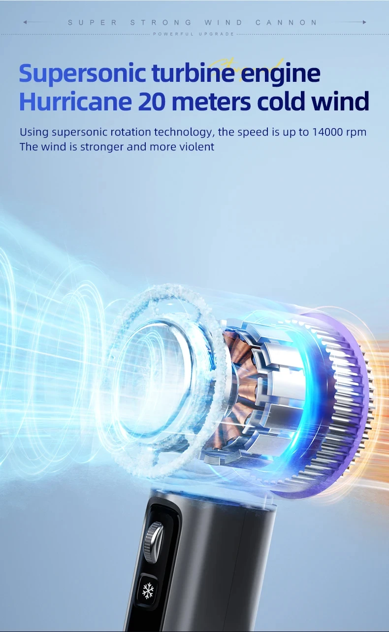 Introducing the Ice-cooling High-Speed Handheld Fan, a state-of-the-art cooling device designed for powerful performance and advanced features. Ideal for personal use, this fan incorporates innovative cooling technology and smart design elements for enhanced comfort.